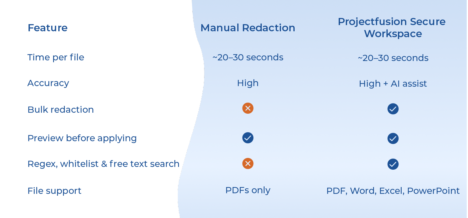Unlike other tools that require exporting files or third-party installs, Hybrid Redaction is baked into Projectfusion’s virtual data room and secure workspace. That means: