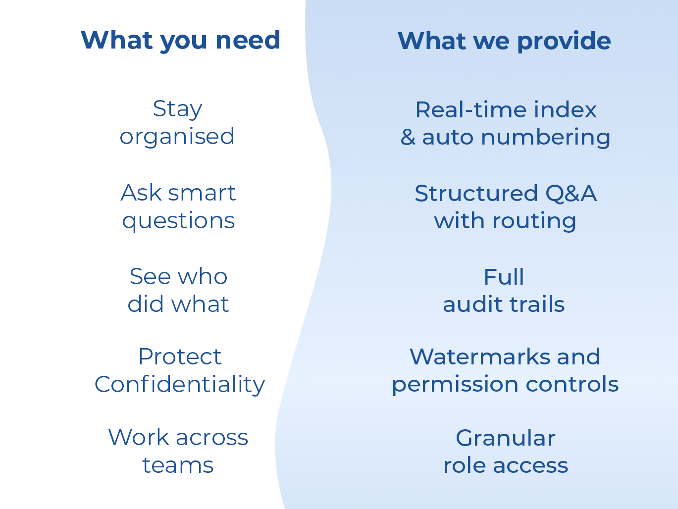 “Everything was just easier—easier to navigate and monitor changes. The layout made it simple to follow. Support was the stand-out feature: fast, helpful, and inside the data room.”