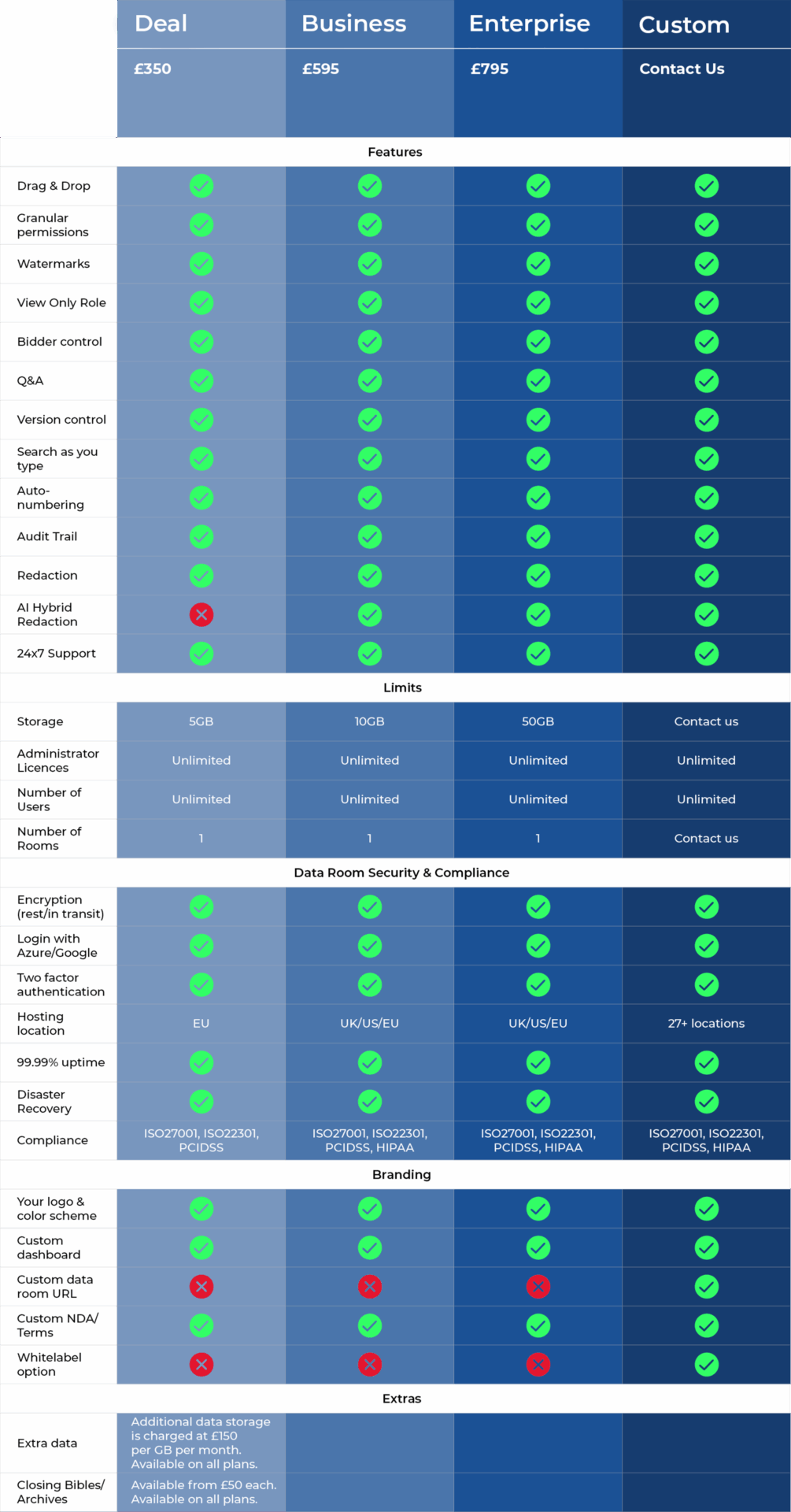 Unlike traditional data room providers, we offer flat-rate pricing with no surprises.